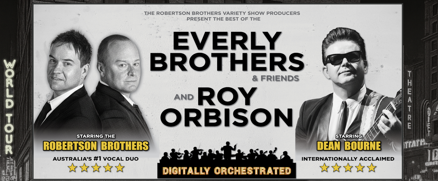 Australia’s #1 vocal duo, the much-loved Robertson Brothers, join forces with the internationally acclaimed Dean Bourne — the world’s greatest Roy Orbison tribute artist — and the Variety Show team for an unforgettable 2-hour audio-visual spectacular.